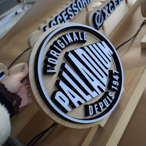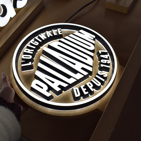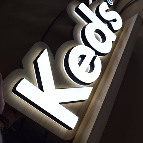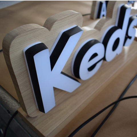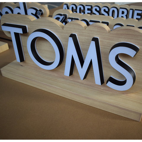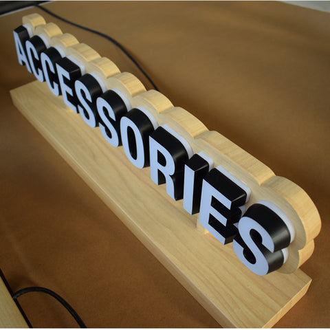 Mini acrylic LED letters are fixed on the signboard which is made of stainless steel by imitated wood color, the letters are double sided lighted by LED, they are suitable for desk show and promotion